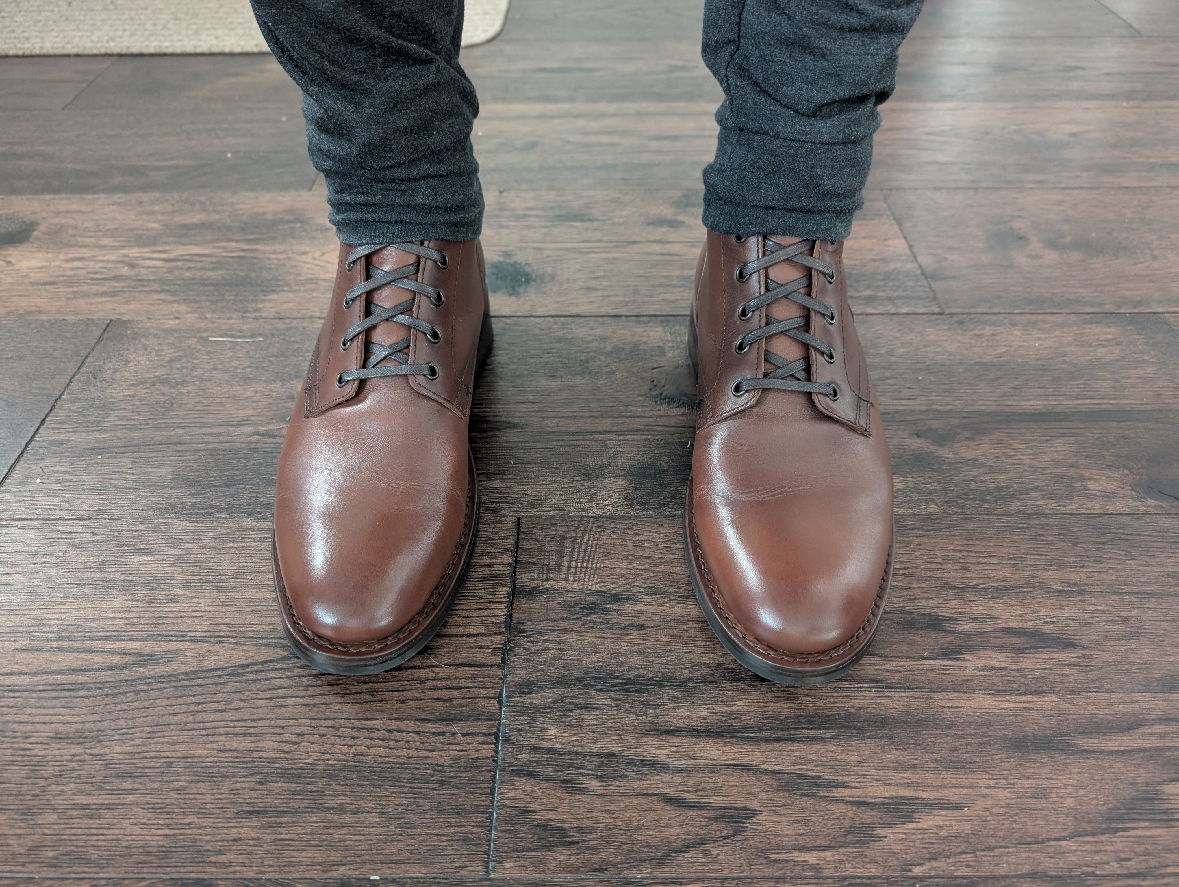 My read is that the President model/line is pretty much the “default” option from Thursday. Laced, no toe cap/moc stitching, no wingtip designs, etc. Which is exactly what I want: a timeless, refined design that will look good with a variety of outfits. I feel fine dressing these down with jeans and a t-shirt, but they also don’t out of place with chinos and a linen or poplin button-up. I frankly have a slight preference for the cleaner upper of a pull-on boot like The Duke, but I plan on wearing these when it’s wet outside, so have porous elastic goring only an inch and change above the welt doesn’t seem like a great idea.