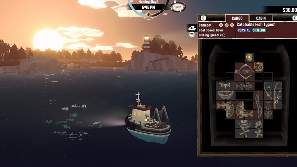 One of the first things you’re told is that fishing at night is dangerous because of the (supernatural) fog that envelops the island. Since I’m a risk-minimizer, I spent the first half or so of the game managing my time in a way that gave me enough time to get to a port and sleep/rest overnight every night. At one point, I was kind of forced to sail through the night, and…it’s just glowing specters that increase your stress/panic along with lowered visibility. No hull damage, loss of resources, or anything else truly impactful.