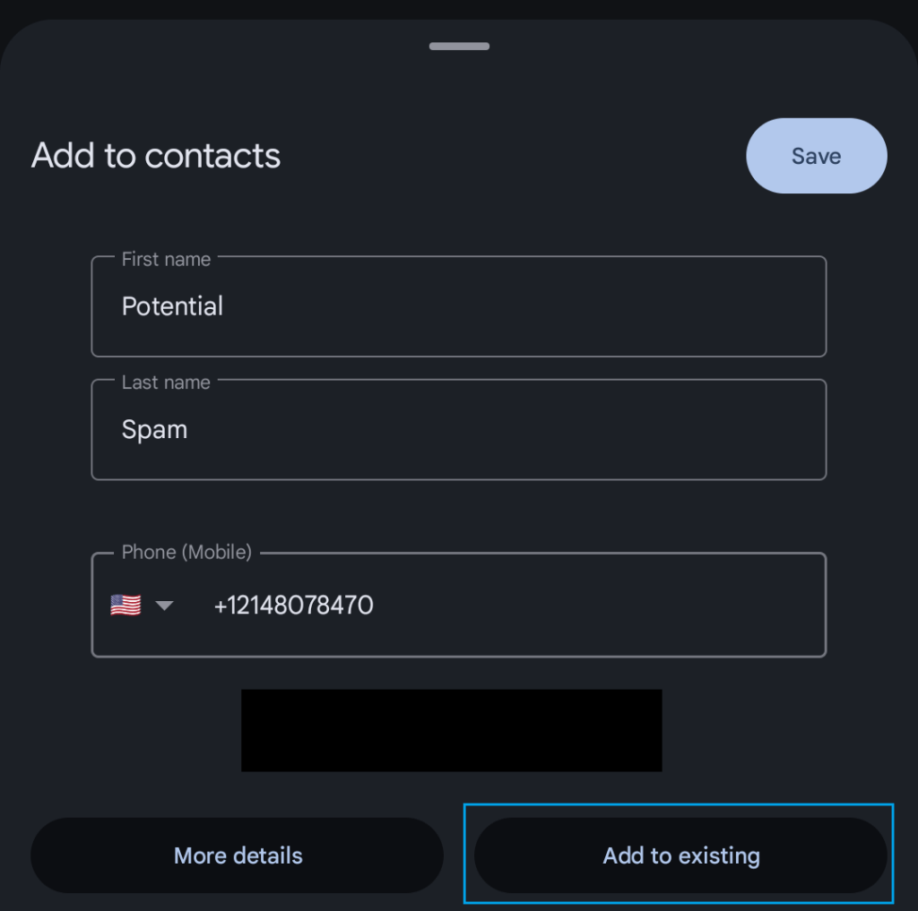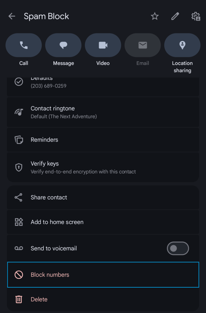 - If you added any numbers that weren’t on your phone’s local block list, select Block numbers on the Spam Block contact.