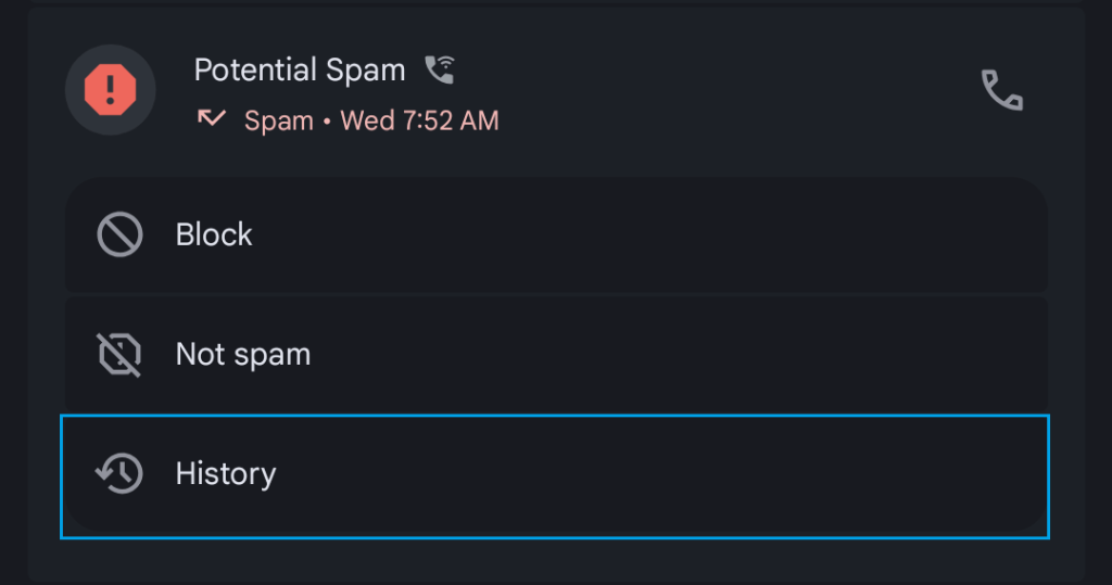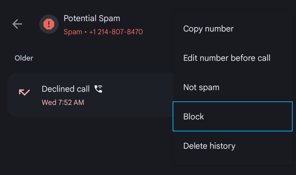 In the history entry, hit the three dots in the upper-right corner and select Block. Confirm you want to block the number.