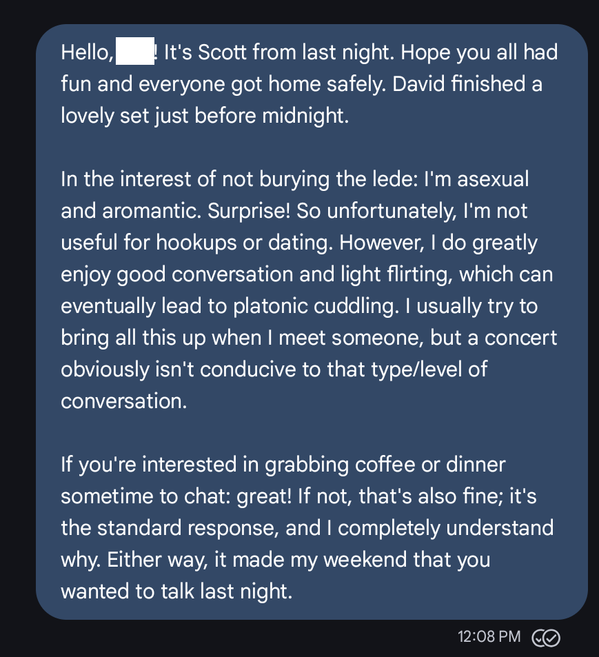 As of this writing (I just realized it’s been exactly two months), I haven’t received a reply. That didn’t bother me initially, but after telling the story to a few friends, it irked me a bit. She’s the one who chose to interject herself into my life by having her friend retrieve me from the balcony where I was having a good/fun evening. In what little time we had to chat, she seemed into the situation, and she was interested enough in a follow-up that she (presumably) gave me her number. But after finding out I was ace, she didn’t have the courtesy to send me any sort of reply. Even a reaction emoji would have been something.